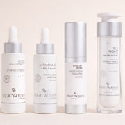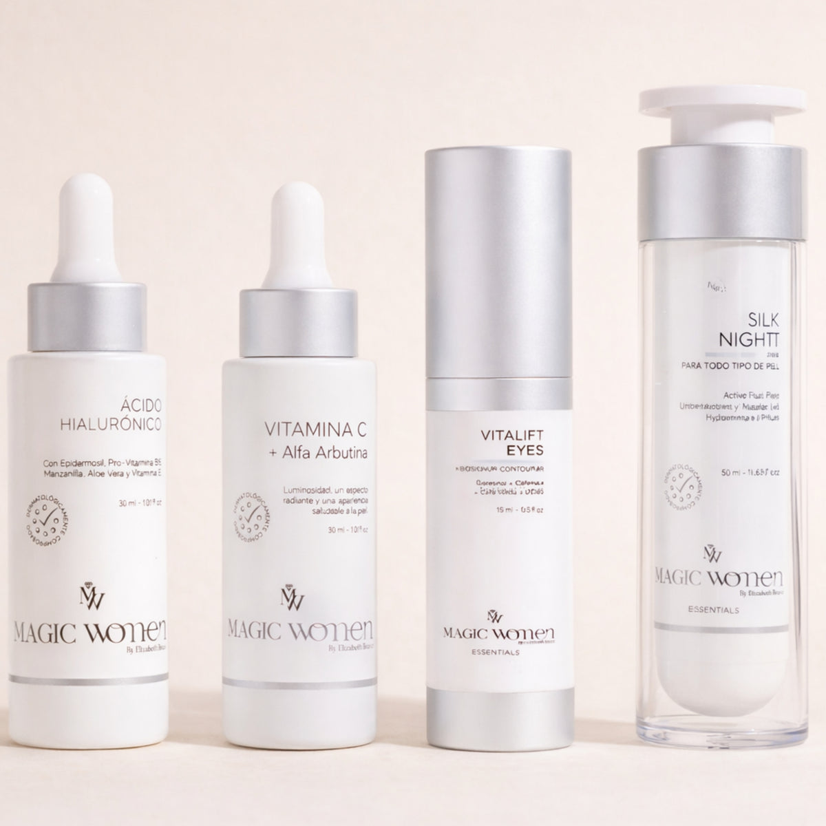 Rutina facial tipo sandwich formulada para hidratar, iluminar y unificar el tono de la piel. Combina ácido hialurónico, vitamina C, contorno de ojos y crema hidratante densa, ayudando a mejorar la luminosidad, apoyar la función barrera y devolver a la piel un aspecto más uniforme, suave y visiblemente revitalizado.