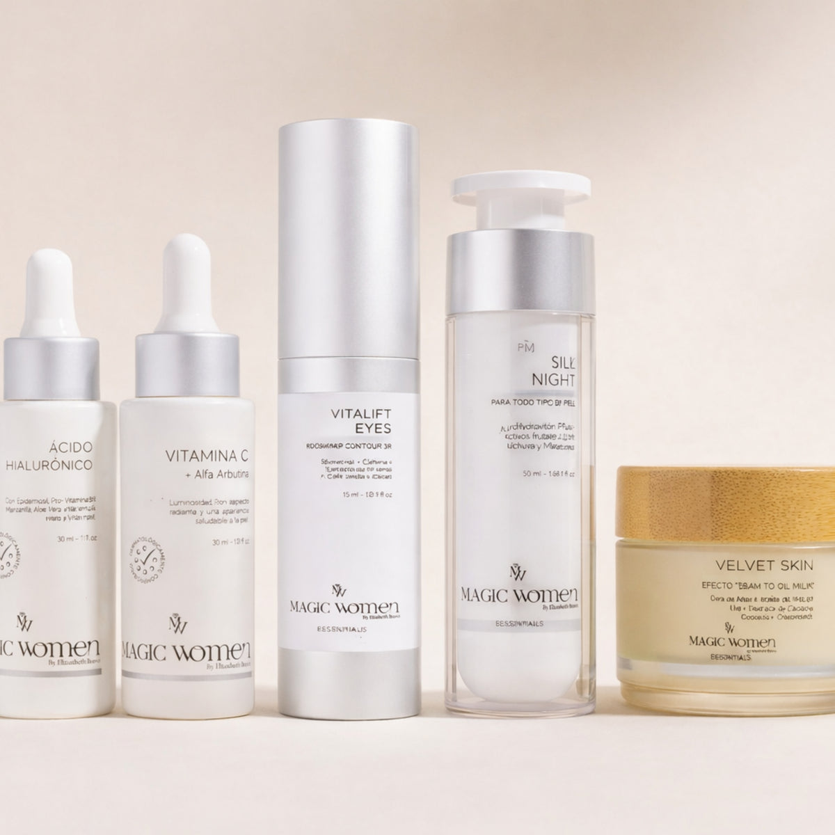 Rutina facial completa tipo sandwich diseñada para limpiar, hidratar, iluminar y nutrir la piel. Integra desmaquillante sólido Velvet Skin efecto oil-to-milk, ácido hialurónico, vitamina C, contorno de ojos y crema hidratante densa, ayudando a mejorar la apariencia de la pigmentación, devolver luminosidad y dejar la piel visiblemente más uniforme, suave y confortable.